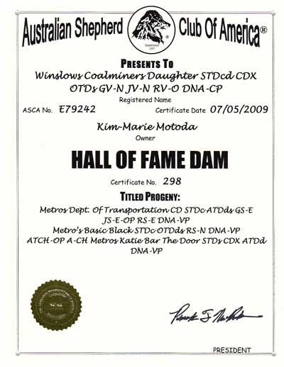 HOF Dam#298 Intl CH Winslows Coalminers Daughter CDX OTDs STDdc RV-O JV-N