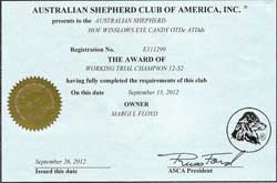 September 2012 - After less than a year of working on sheep and trialing on cattle, assisting her each time - even when it meant crossing the handler's line again and again, we went back to eastern Oregon and gained that final Cattle leg to finish her Working Trial Championship with a 4th place in a large class and decent score of 102. Although her morning run wasn't the best, with the insight from a judge and others, her afternoon run was close to picture perfect.