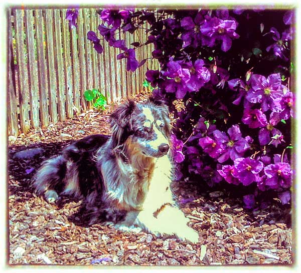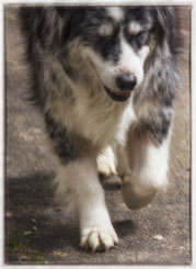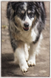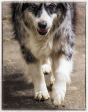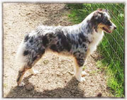 Courtney was my pick from day one out of this litter. (Actually she picked me!) There was just something special about this bitch that I liked. Maybe she reminded me of her mom, as, like her, she also had rear dewclaws! And, although a blue merle, Courtney has similar face markings as her mom. And, when her eyes started to change color? Ditto! Courtney's left eye has just a smidgen of amber!