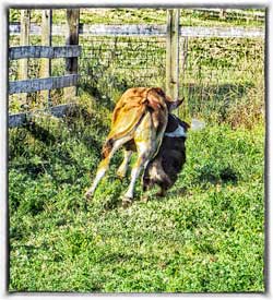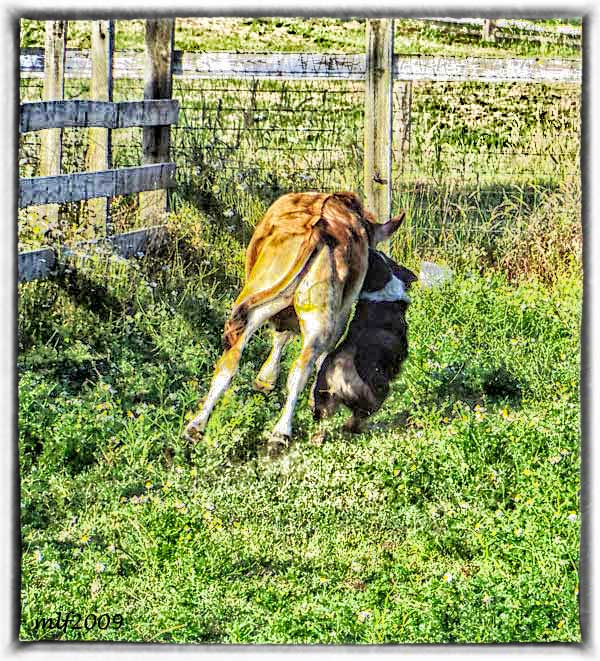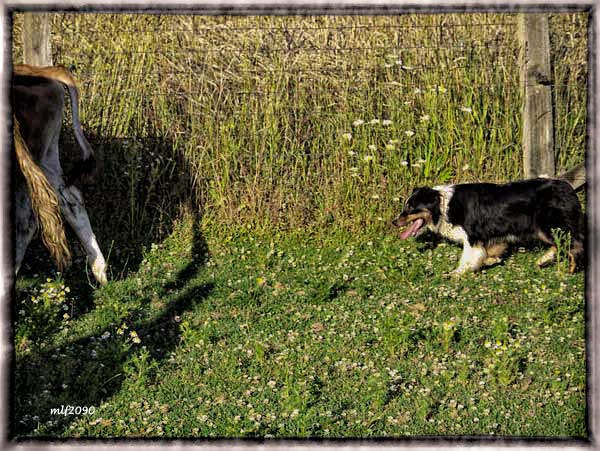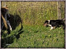 Honor is NOT just a pretty face either. She is tough! This is one hard hitting little working girl. She hits hard on the front and rear. Heels, heads and right now thinks tails are cool too. She was kicked, trampled, head butted hard but never quit. She then showed me her nice natural drive and wide working style. For the most part she is a quiet worker with seldom a bark and when she does, it usually just one bark. She pretty much shakes off kicks, head butts, etc. and keeps right on working. She's tough, she knows it and she makes her point known to those who think they are tougher. Around other dogs she is pretty easy going. |