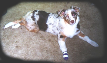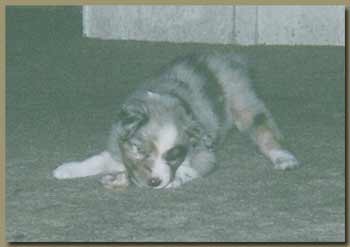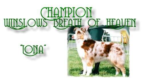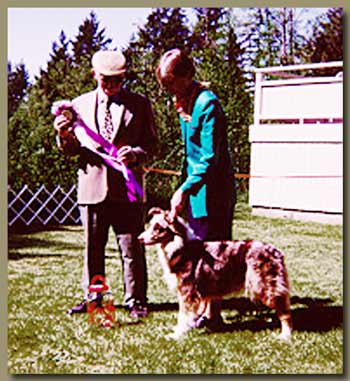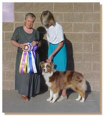 At her first Nationals in 1996 she took a Third Place from thry large 9-12 Class - fully out of coat AND in full blown season! Needless to say, Iona has the presence and conformation to win. Her first time out in the AKC ring she came home with a reserve win but followed this up the next day by going Best of Breed / Best of Winners for her first points! She has continued to win ever since - whether it's points or peoples hearts! In early 1997, Iona started her training in competitive obedience with a local yet well known and highly respected trainer. Continuing in her mother’s footsteps, Iona has been a dream to train on stock as well as in obedience. She seems to have read all the books and knows ahead of time what it is that I want. She is incredibly biddable and this has passed over to her work on sheep. There she is a dynamo! True to Aussie nature, Iona is a great fetcher that rates her stock well and does not over work them! Due to a back injury though, Iona has not resumed training in Obedience or on stock and is shown selectively. |