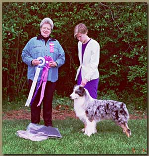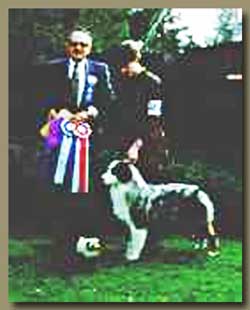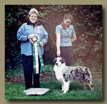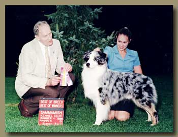 After a year off Mikey continued his winning ways in 1999 by taking a Group 1 in Herding Group Best Bred By February '99 at the large Seattle Kennel Club Show and a Group 2 Herding Group Best Bred By at the Vancouver Kennel Club show in May '99. Shown with judge Sharon Krogh, Mikey came out for his first ASCA Shows of 1999 to take another FIVE POINT BEST OF WINNERS! This was the first ASCA show that I was able to take him to as I was also recovering from a broken foot! |