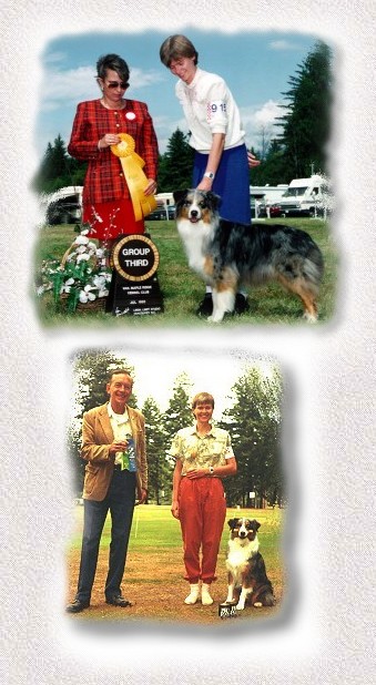 Tarey started her career at the young age of 2 months with many Best Puppy and Best Opposite Puppy wins in tough Southern California competition. At 10 months, Tarey competed and gained her first leg on her CD. In the Spring of 1988, we moved to Washington State where we met a host of new people and new dogs. In the Summer of 1988, Tarey's first time out in the ring since California, she came away with Two Reserve Winner's to 5 point Majors! Judges were Ted Luke and Chuck Krueger - both who later went on to give Tarey her two last majors and both with Best of Breed wins over top Specials! Tarey took time off periodically from the show scene to whelp her only two litters. In between those times, she was able to get out to the shows and pick up her first 5 pt BOS/BOW under judge Dennis Morgan and 4 pt Major under Judge Claire Lincoln. The Summer of 1993 was one of our happier times as well as sad times. In June of 93, Tarey was handled to her first Breed wins for another 4 point major. Unfortunately, it wasn't but a few days later that we learned Chase, her buddy from the time their were pups, had to be put to sleep due to internal bleeding and other complications. In his memory we devoted finishing Tarey's Championship to him. Tarey later went on to gain another major reserve that month and finally, in July on her daughter Juli's 4th birthday, she went Best of Breed again to finish her ASCA Championship AND her ASCA CDX followed by her first leg on Started Sheep! |