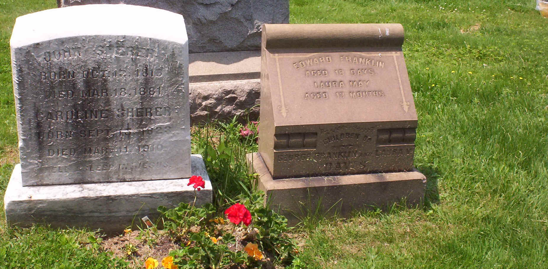 Emanuel's first wife Annie J Sherer Born: 1843 Died: 9 October 1872 of Consumption Annie Sherer Cox is buried with her son at Mt Peace Cemetery in Philadelphia, PA Section C lot 117 Grave 1. The cemetery has it noted that Annie and Jacob have a monument. There is not. Per cemetery records shows that there is suppose to be a headstone cradle at their grave. Grave 2 - is Frank Davis and Laura Davis, have a headstone. These are the children to her half sister Laura Sherer Davis Grave 3 - is Caroline and John Sherer have a headstone. Also there is a Caroline Craft buried here as well. Relationship unknown at this time.