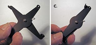 suspension system devised by Brooxes Compact Picavet Cross (A) is about as small as the X can go, and is standard on all Brooxes kits. With built-in eyes for the line, the BCPC at its simplest requires no additional hardware except some means of attaching it to the flying line. If you want a more elegant, smoother Picavet, add PeKaBe ball-bearing blocks [below] by rotating the X 90 degrees and mounting the blocks on the built-in eyes. The Gent-X (B) is the result of James Gentles' testing of several variations of the Picavet cross. He found that the most rotationally stable was one that had a cross bar much longer than the fore-and-aft member. The Gent-X is best-suited for rigs for large cameras and/or auto-rotating panorama mechanisms. It must be used with PeKaBe blocks (or small split-rings) in order for the cross to be oriented in the proper direction. The Folding Picavet Cross (C), designed to make small compact autoKAP rigs even more compact. This one is supplied with a separating nylon washer and a hitch pin. Included