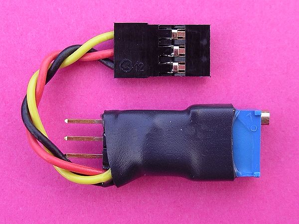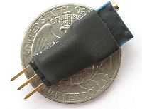 GENTLES’ NEATEST GOODIE! Shown here at about 130% of actual size is the clickPAN-IR, nicknamed “peanut”, which combines the ultra-compact size of the genTIMER above with circuitry to control both shutter and 360° camera rotation. This tiny electronic marvel is specifically designed for minimalist autoKAP rigs such as those built with Brooxes Electric AutoKAP Kit, shown here with a Pentax Optio S4. The peanut comes in three variations, one for cameras that can be triggered by an infrared signal, one for CHDK-modified Canons (see above), and one for servo-triggered cameras. Note that if you don't want your rig to pan between pictures, simply unplug the pan servo. Of course, the clickPAN may be used only as a rotator if you'd prefer to trigger the camera with an internal timer. Pack a lunch, launch your rig under a small kite, kick back, and let the peanut do the work! For cameras with infrared remote triggering, use clickPAN-IR Plug a 3 - 5v battery into one set of pins and a 360-converted servo into the other set of pins, position the peanut so the LED is next to your camera's sensor, and it does the rest! About every ten seconds, the servo rotates your rig a partial turn, stops, and then the LED triggers your camera. It'll keep doing that until the memory card is full or the batteries run dry. If you'd like to adjust the time interval between pictures, add the clickPAN-ADJUST, below. The clickPAN-IR is normally made to turn in ~30° increments. Please send a note with your order if you would prefer a rotation of ~60°. The clickPAN-IR is compatible with cameras listed in Groups 1, 3, 5, and 6. clickPAN-IR: U$32.00 postpaid
