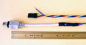 gentWIRE-USB (Canon) This variation, which looks identical to the one above, is for controlling Canon point-&-shoot cameras which have the unofficial CHDK firmware enhancement, with or without the SDM variation, reputed to be better-tailored for KAP. This non-destructive modification is added to the camera via the SD card, enabling many creative possibilities for remote photographers. The gentWIRE-USB (Canon) replaces a shutter servo, triggering the camera through the USB port. It may be used in conjunction with a conventional radio control system or the AuRiCo controller, or with a simple wired switch. Weighing in at just 9 grams (1/3 oz), the gentWIRE-USB (Canon) includes ~250mm (~10") cables and both connectors. It is compatible with many Canon models; for a complete list, see here. A script is necessary, along with the CHDK software. Links to both of those and a complete tutorial on the installation may be found here. gentWIRE-CHDK: U$44.00 postpaid