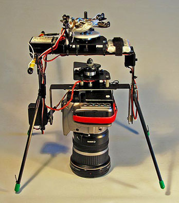 ...for cameras needing a servo to push the shutter, use clickPAN-SERVO This device [left] looks nearly identical to the one above, but instead of an infrared LED, it has a servo plug. The rig rotates in the same fashion, but instead of emitting an infrared pulse, the clickPAN-SERVO sends a pulse to a second servo, which pushes the shutter button with a mechanical finger. It's the heart of the Servo-BEAK. clickPAN-SERVO: U$34.00 postpaid