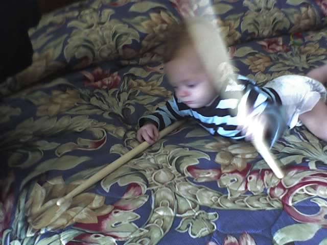 When we played with the B-52's on the Cape, I picked up some new drumsticks for Mino. They were on the hotel bed iin their chopsticks-like wrapper when I set the baby down and turned my back for a second. I heard the whisper of paper being whisked free of wood and turned around in time to see Lake click the sticks together and then - as God is my witness - start keeping time. The family band is now complete! He had to be either a drummer or a roadie...