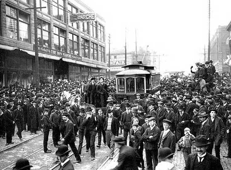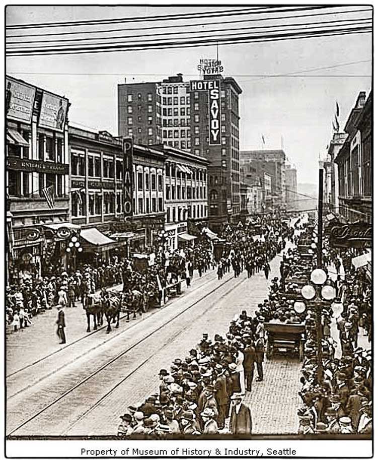 In 1909, twelve thousand trade unionists marched through downtown Seattle on Labor Day, parading but also protesting the Alaska-Yukon-Pacific Exposition Company and its open shop policy for the construction of the site at the University of Washington. Though the company hired many Union construction workers, Labor still called for boycotting the Exposition.