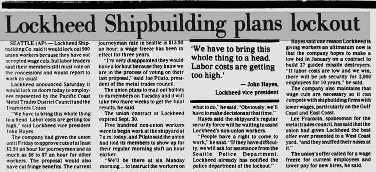 On November 17, 1986, Lockheed locked-out the 900 Metal Trades workers who were employed at the shipyard, (some would describe this as an employer strike). Local 46 had 143 members at Lockheed.
