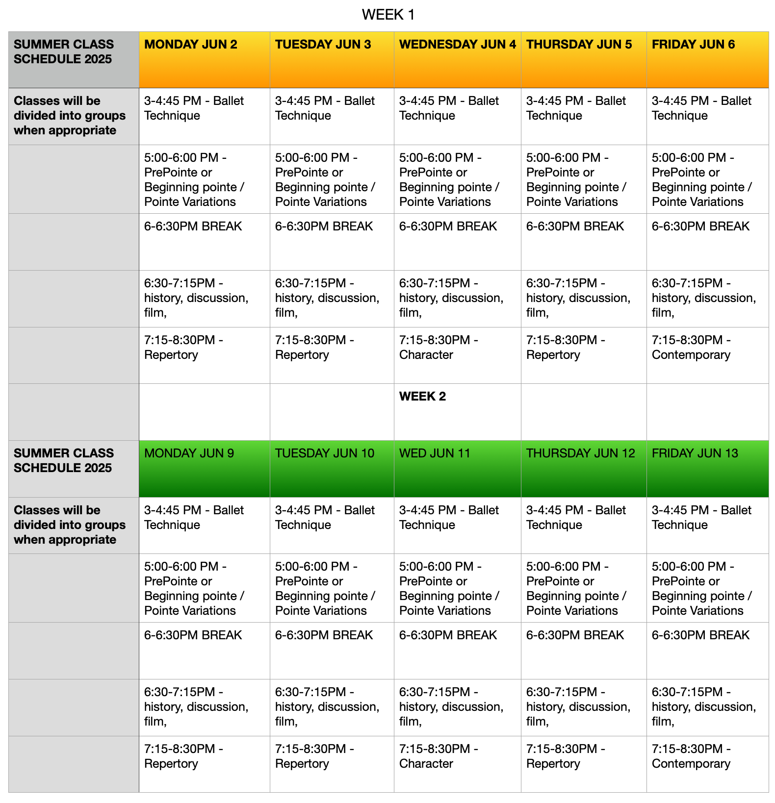 Our summer session is designed to engage the physical training of ballet while discovering the excitement of different movements, different uses of the ballet vocabulary and different ways to state those elements. Learning that ballet is more than steps and provides a platform for new ideas is a refreshing change for an art form steeped in discipline and tradition. In other words - we have a lot of fun.