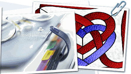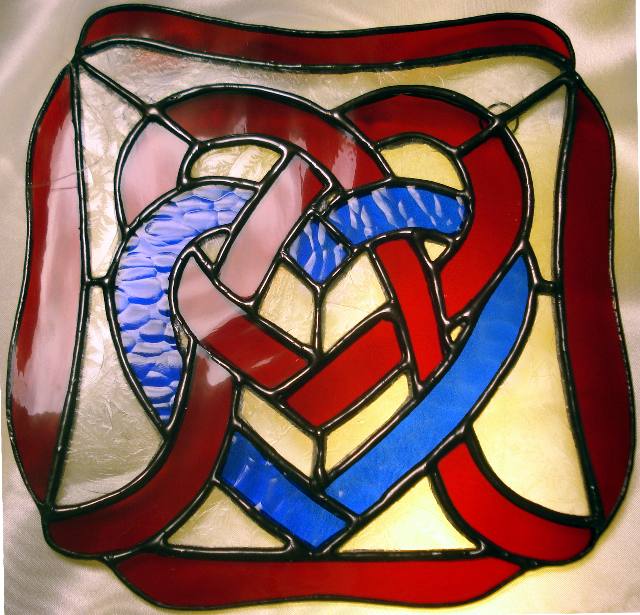 is approximately 8 inches square. It is composed of blue and red textured glass joined together in the fashion of a Celtic Knot. It can be special ordered in other colors.