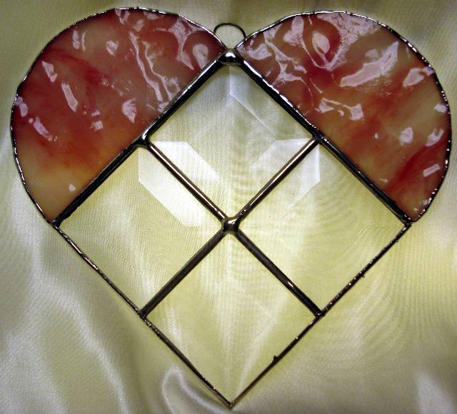 This heart is made from four clear glass bevels, topped with textured pink glass. It is approximately 7 inches.