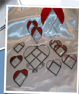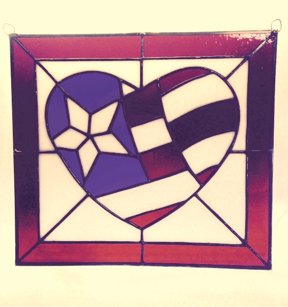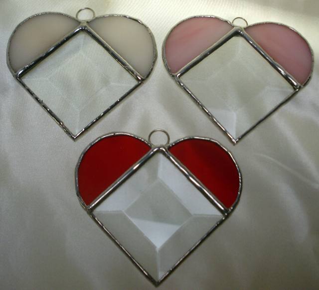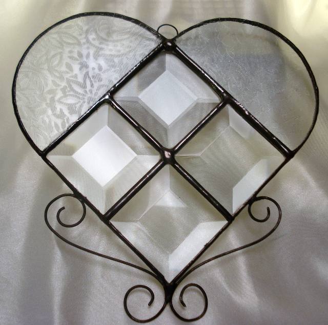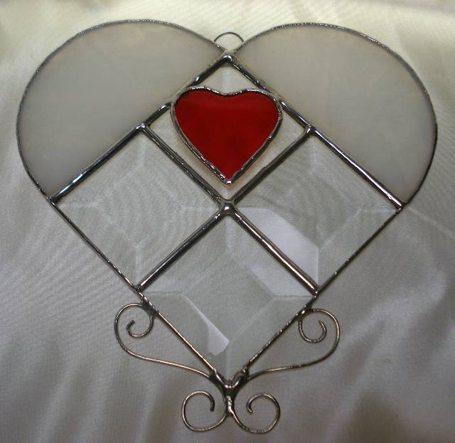 is made of four clear glass bevels, topped with white smoky glass. It has a small red heart overlayed on it.