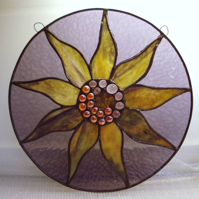 Round suncatcher with Youghiogheny glass petals surrounding an ammonite fossil. Approximately 12"