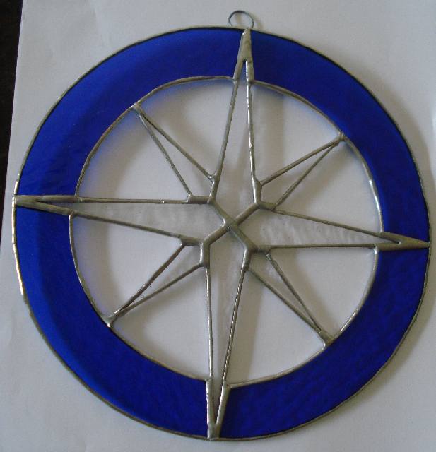 A compass star made of textured clear glass, surrounded by cobalt blue. Approximately 8"