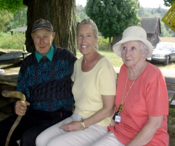 Cele, center, and City Councillor Barbara Swords, enjoy a September Corn Fesival with Konstanti (Kayo) Crzanowski, left. The celebration, staged on the 67-acre farm by the Winding River Land Conservancy, was held to thank the 85-year-old farmer for putting the acreage, farmed by his family for more than 100 years, under the state's Agricultural Preservation Restriction program. (9/02)