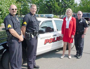 Cele meets with some of Westfield's finest at the Hampton Ponds Plaza before the 2001 edition of the Hampton Ponds Fourth of July Parade. (7/01)