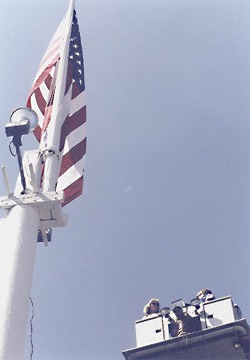 Cele, with help from the Westfield Fire Department, raises the new giant version of Old Glory she donated to the City during Fourth of July ceremonies on the Green downtown.