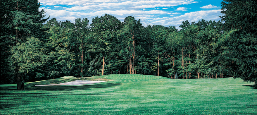 This painting features the 11th hole of Kahkwa, otherwise known as "Court." The nickname was coined by lawyers
