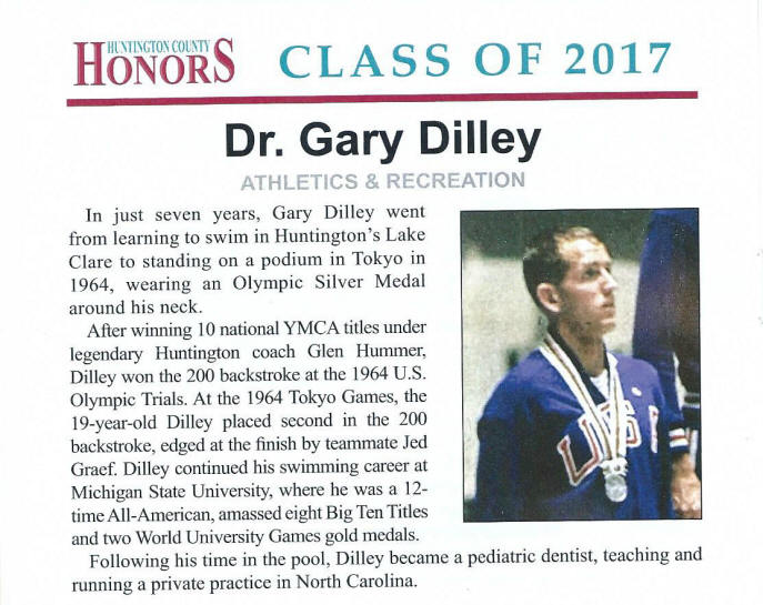 Robert Bao OLYMPIANS - GARY DILLEY (Summer 2008) Member, U.S. Olympic swimming team Silver Medal, 200-meter backstroke, Summer Games, Mexico City In 1964, people in the swimming world did not know much about Gary Dilley, ’67, a freshman swimmer at Michigan State. “I was a dark horse then,” recalls Dilley, who hailed from Huntington, IN. (Dan Quayle, two years behind in high school, was also an unknown then.) At the Olympic trials that year for the 200-meter backstroke, Dilley shocked the world by winning the Olympic trials. In the finals in Mexico City, Dilley beat the world-record with a 2:10.5, but his teammate Jed Graef out-touched him for the gold with a 2:10.3, a new world record. After the Olympics, Dilley won four NCAA titles—100- and 200-yard backstroke in 1965 and 1966—and six Big Ten titles—100- and 200-yard backstroke in 1965 and 1966, and the 400-yard freestyle relay team in 1965 and 1967. He went undefeated in collegiate competition until the NCAA finals of his senior year—ironically, in his home pool at MSU. In 1965 Dilley added a world championship in Budapest, Hungary. “At that time, MSU had wonderful facilities—now they’re antiquated—and they were trying to get a dental school,” recalls Dilley. “I was disappointed when the legislature put an end to that.” Dilley went to dental school at Indiana University and moved to North Carolina in 1973. He opened a private practice in orthodontics in 1983. “I had a great time at MSU,” recalls Dilley, whose roommate was football star and fellow MSU Athletics Hall of Famer Gene Washington. “Having traveled to every campus in the Big Ten, I can tell you there was not a friendlier place than MSU. It was probably a reflection of President John Hannah, because that was his personality.” |