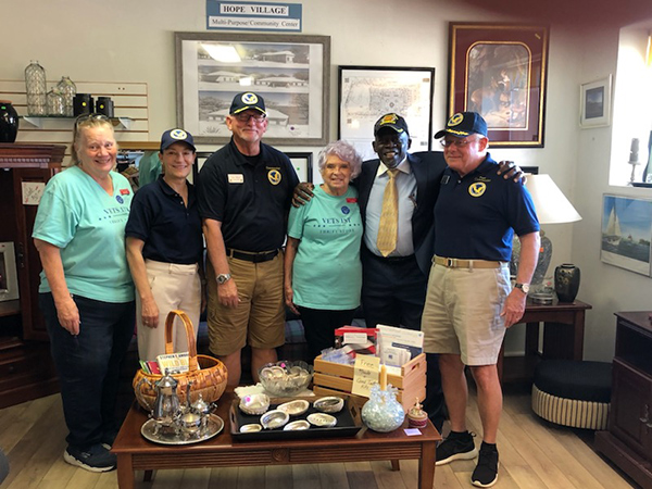 The members of the Sun City Veterans Association (SCVA) provide food, clothing, blankets, sleeping bags, backpacks, donated furniture and financial support for our mission to assist our veterans. The above photo was taken during a site visit to our thrift store by members of the SCVA Executive Committee: (From right to left are Tom BeGasse, SCVA Trustee and Past Commander; Rev. Dr. John C. Dortch, Founder/President /CEO, Circle of Hope Ministries; Linda Pienick, Veterans First Thrift Store Volunteer; David R. Davis, SCVA Commander; Elizabeth Gawrysiak, SCVA Marketing Director, and Tracee Campas, Veteran First Thrift Store Volunteer.
