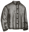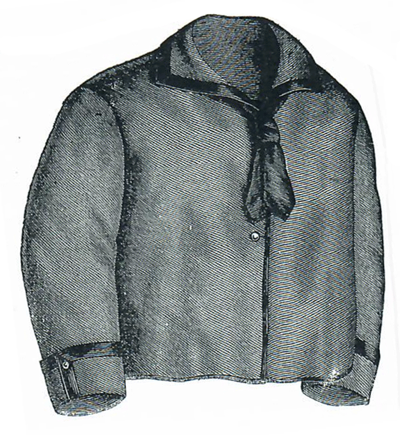 jacket is trimmed with a ruche and two bows of satin ribbon.