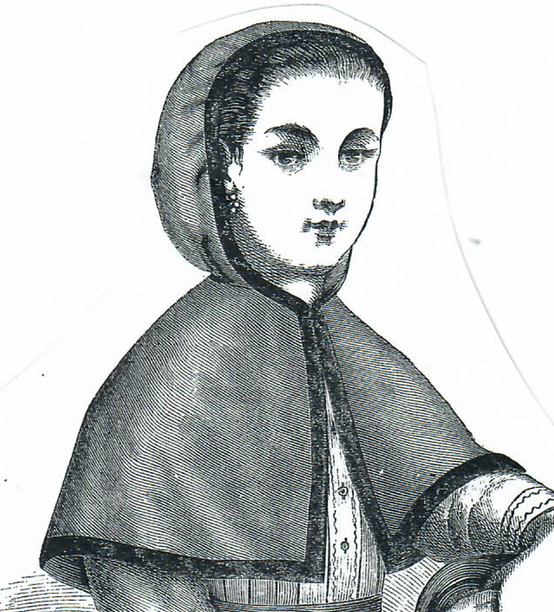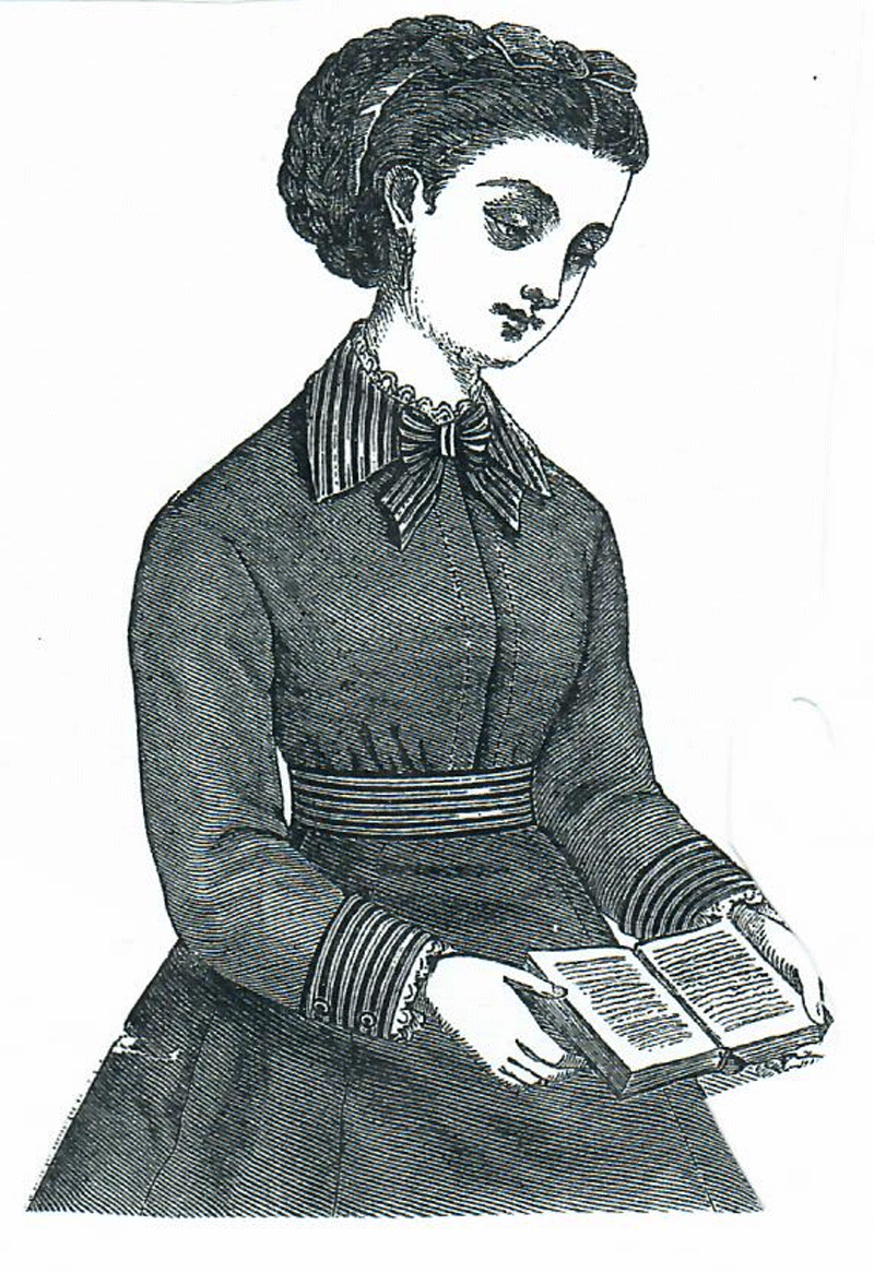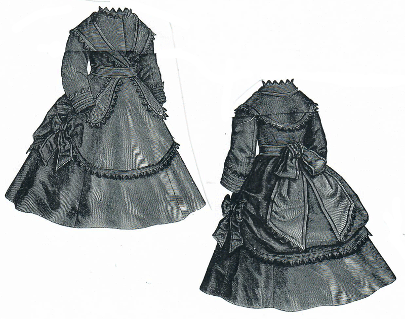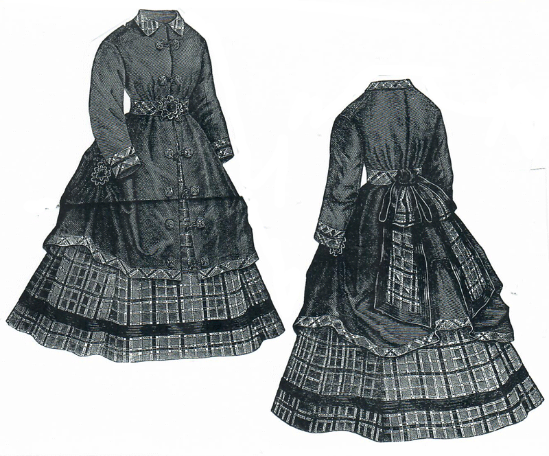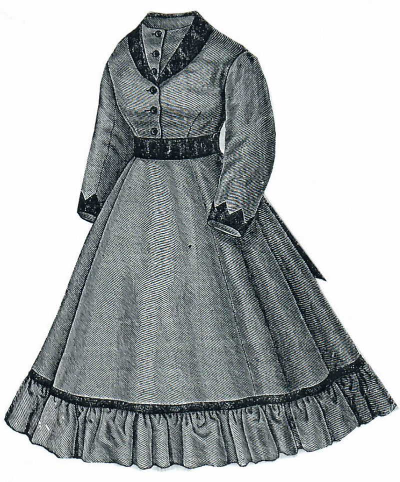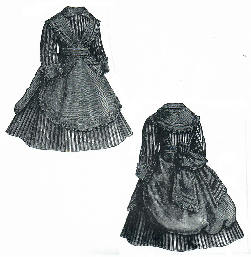 are of black and gray striped poplin; the upper skirt, belt and sash, fichu,
