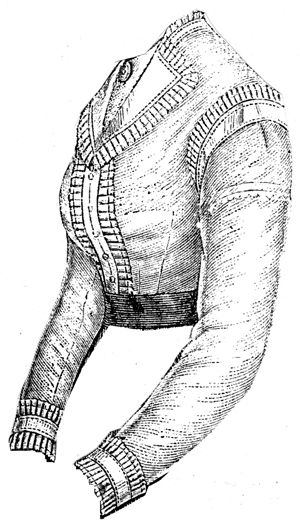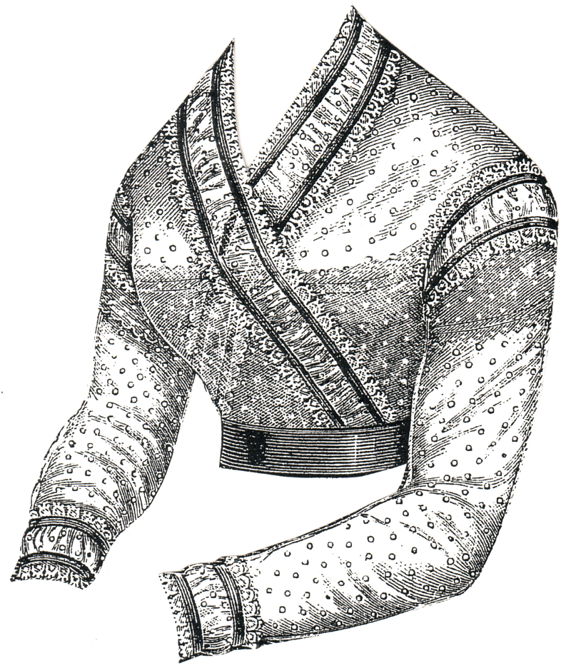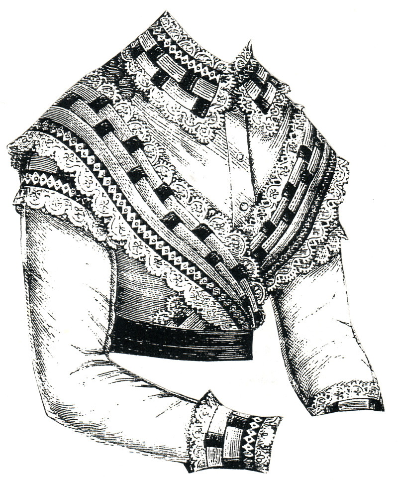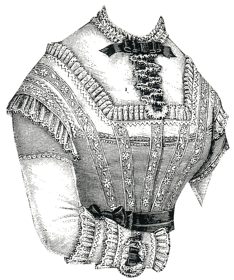 was of muslin. The collar, bretelles, and trimming of the sleeves are
