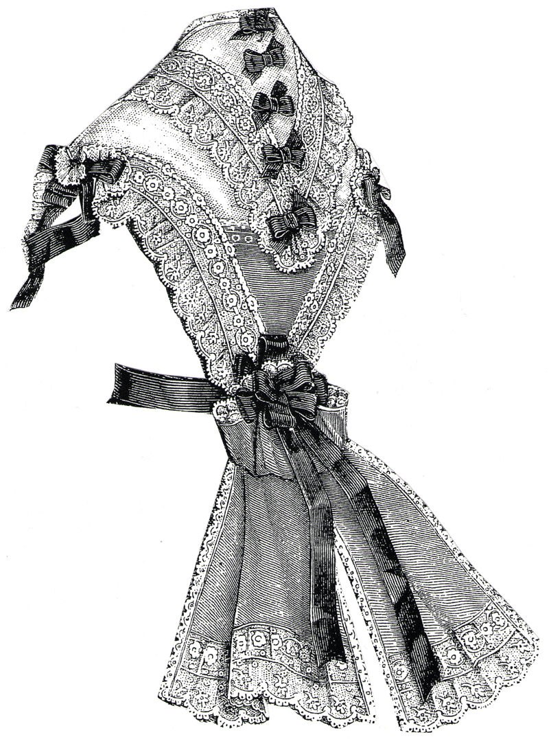 insertion, wide and narrow lace edging, narrow satin piping, and satin bows.