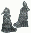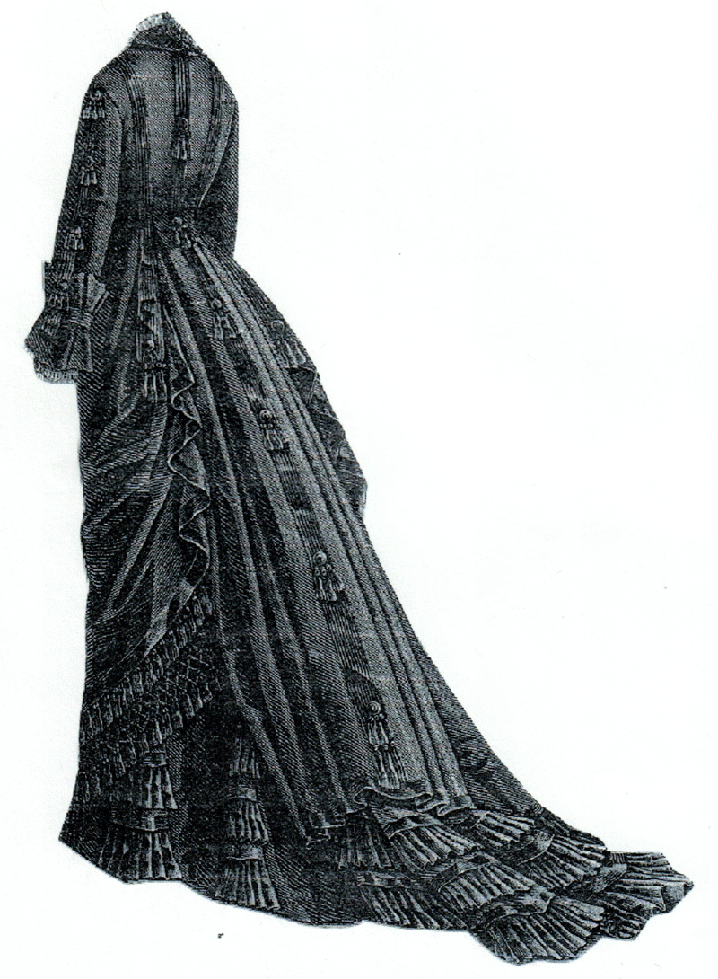 polonaise, and is trimmed with side-pleated ruffles of the material, folds,