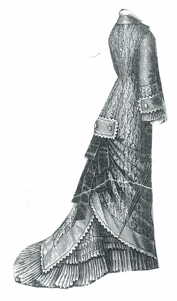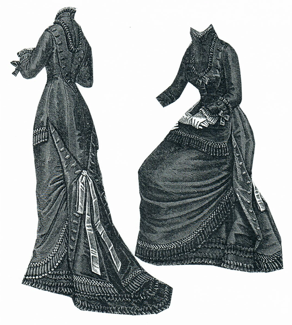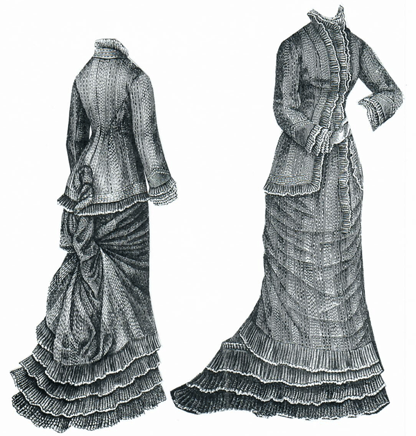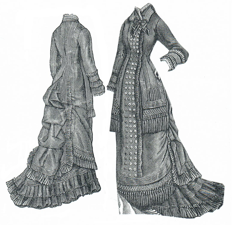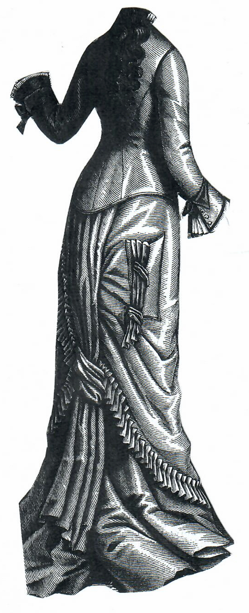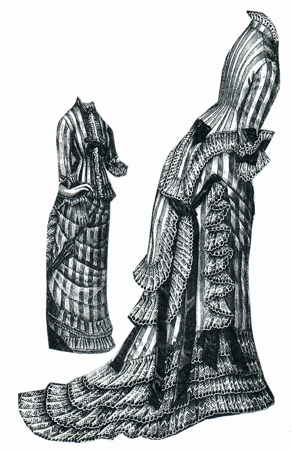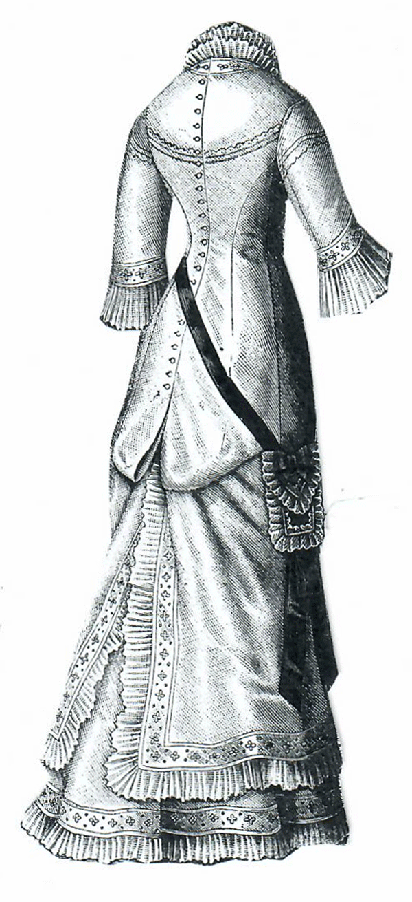 consists of a skirt and polonaise. Trimming consists of box-pleated