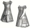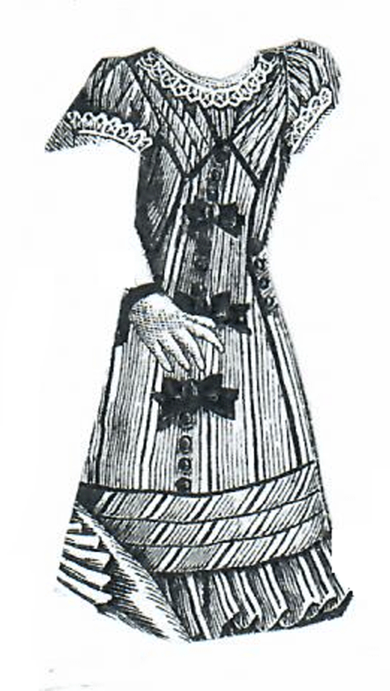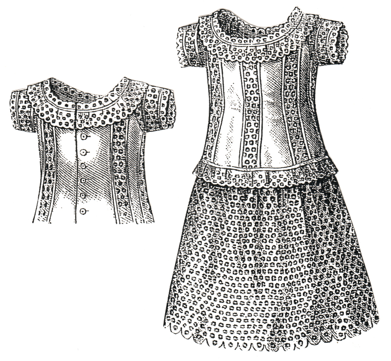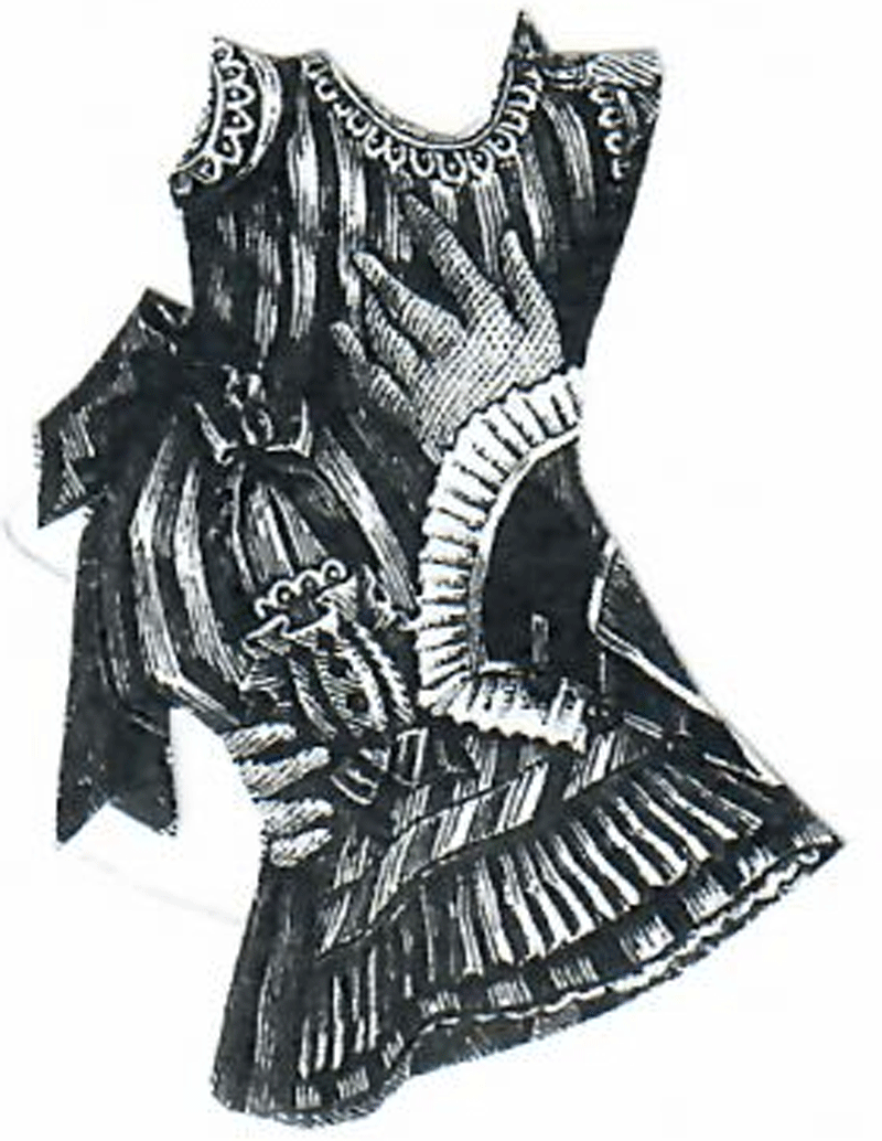 of a skirt and blouse waist, and is trimmed with ruches of Swiss muslin.