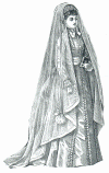 Belt, sash and pocket of white faille, and cap and veil of Malines tulle.
