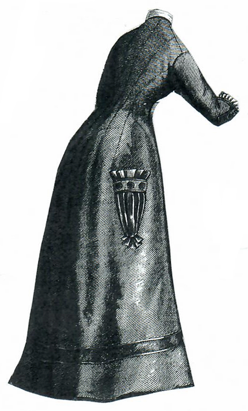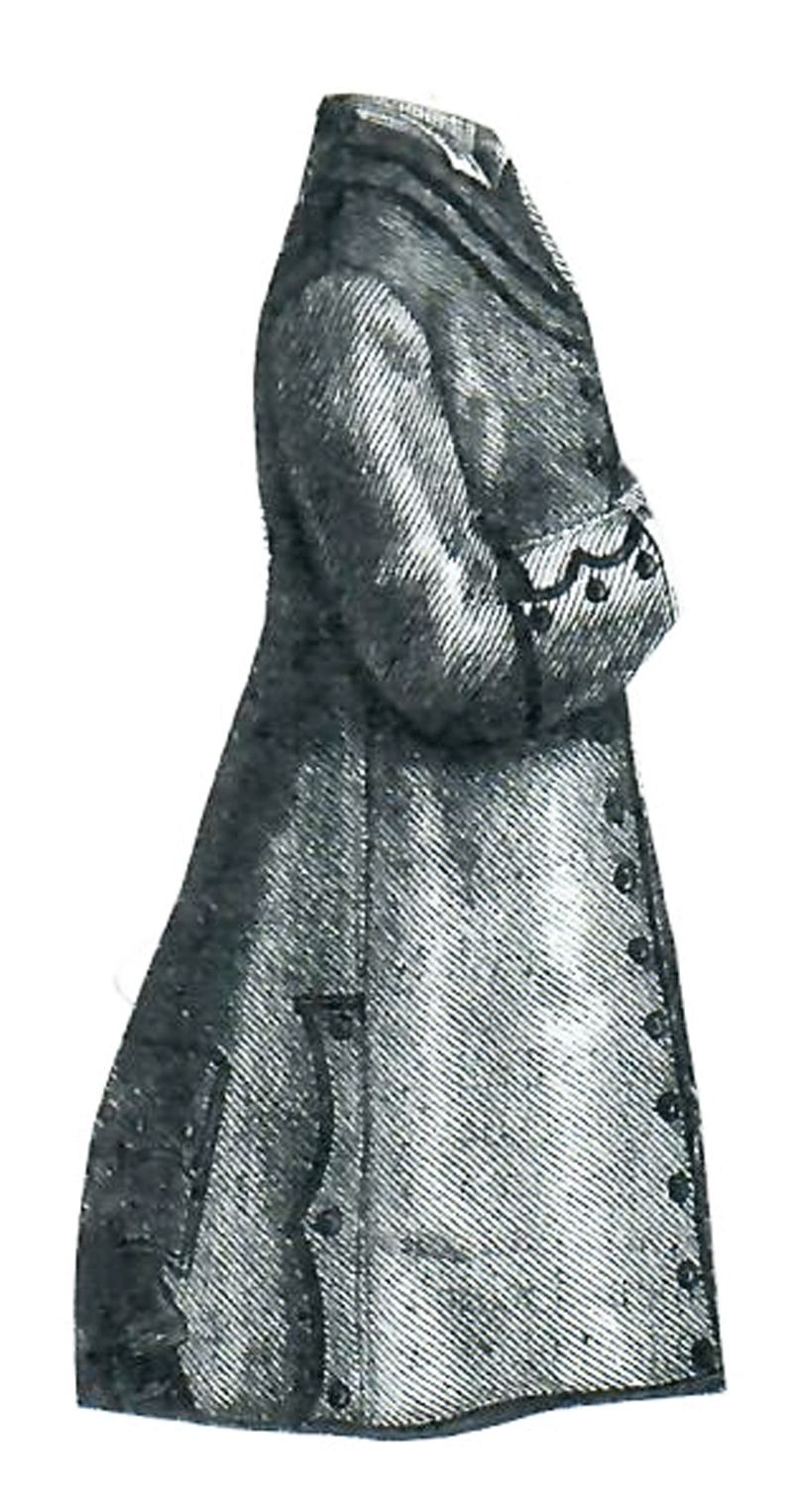 trimmed with rows of stitching of white silk, and white pearl buttons.