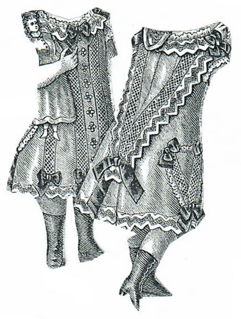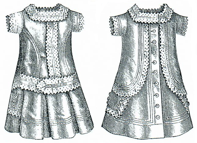 is trimmed with needlework edging, white soutache, and pearl buttons.