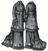 trimmed with side-pleated ruffles of the material and with folds and tabs of