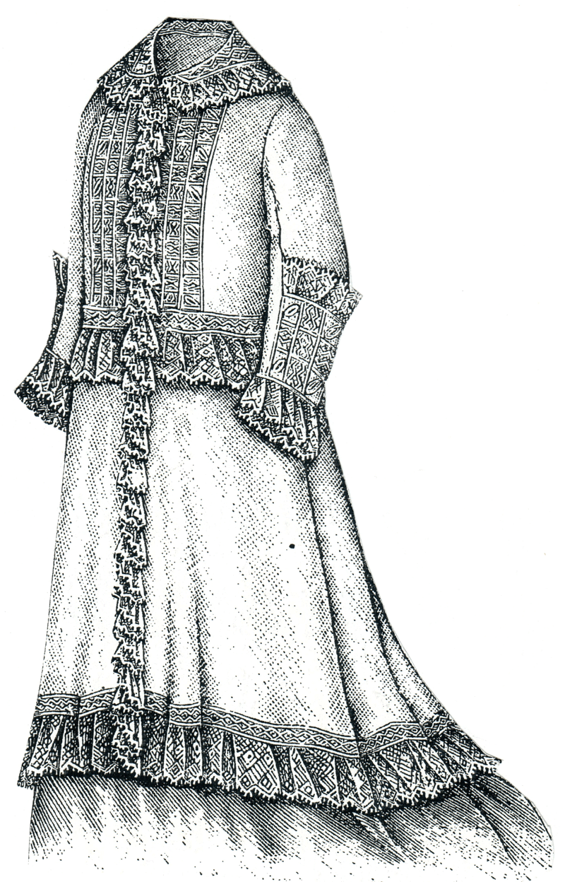 sacque, consists of lace insertion, needlework insertion, and gathered lace.
