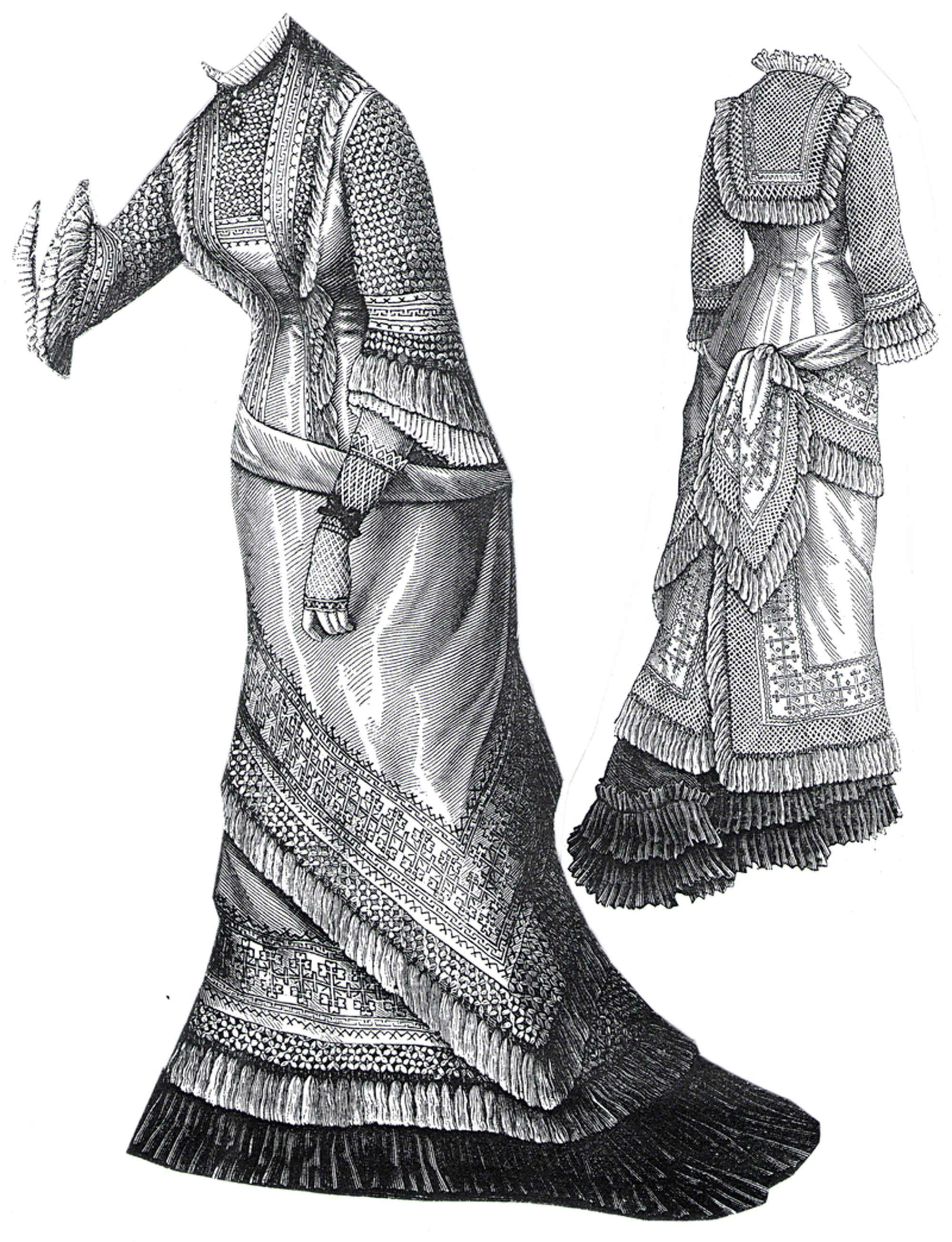 and waist are made of white batiste, and are trimmed with knotted fringe and