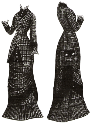trimming on the skirt consists of a kilt pleated flounce of black velvet with piping on the jacket.