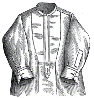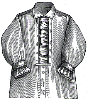 shirt, with linen bosom and cuffs, is closed in front with buttons and