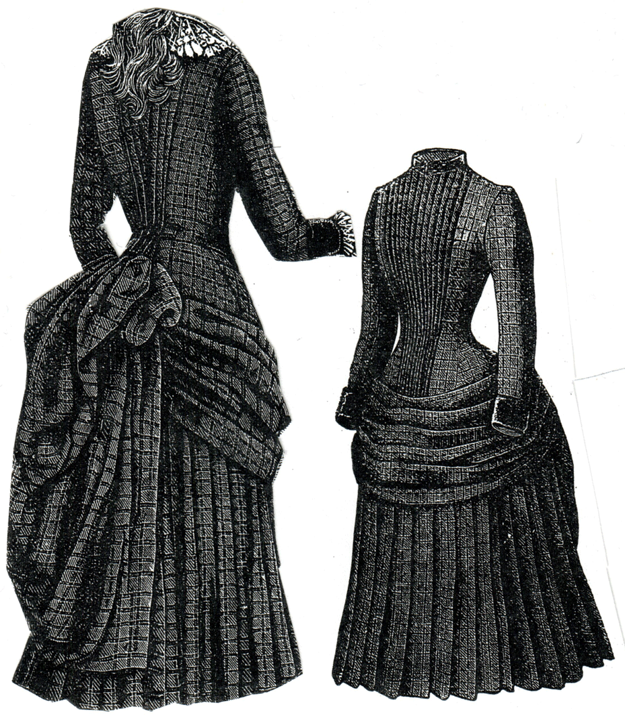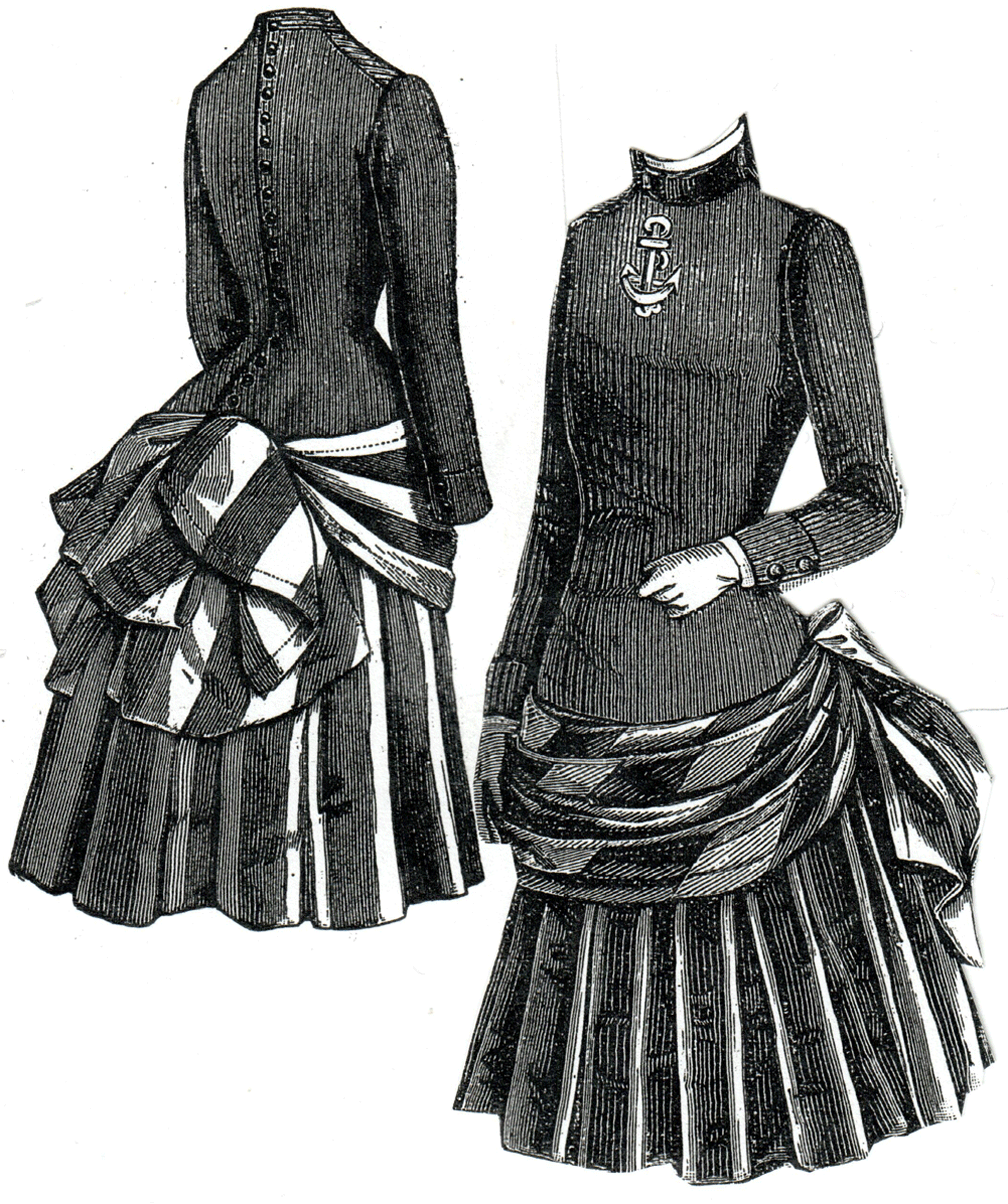 jersey cloth, with a box-pleated skirt of wide-striped blue and tan-colored