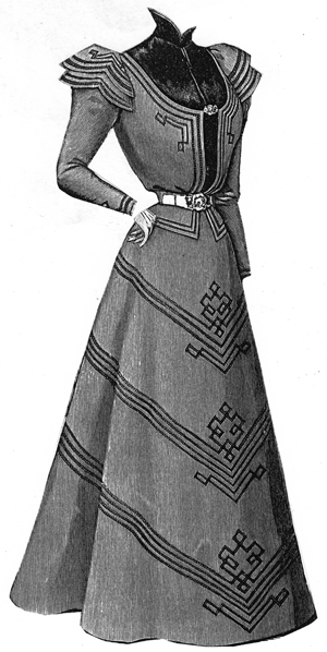 of dark blue camel's hair cloth trimmed with watered silk of the same tint.