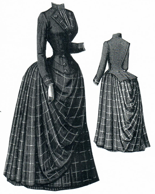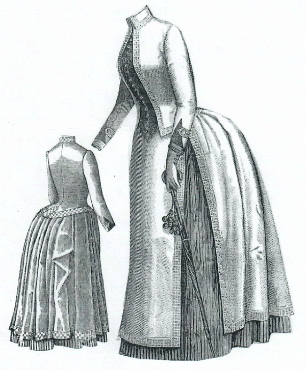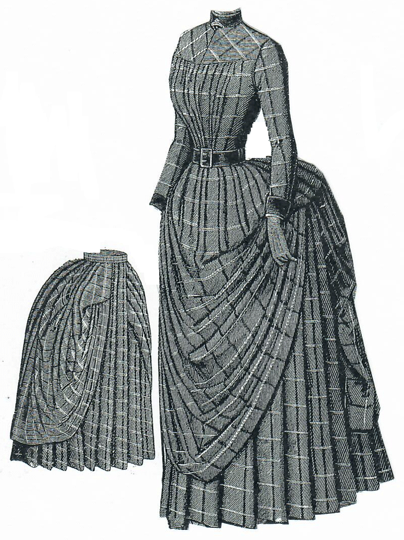 Pattern consists of a basque, overskirt, foundation skirt and kilt-pleated