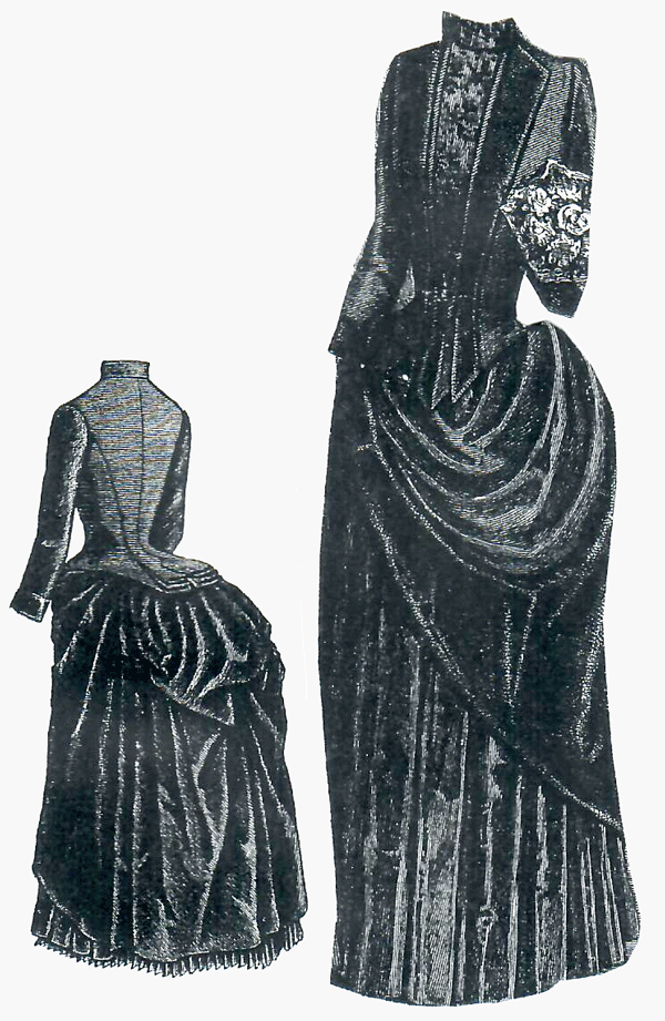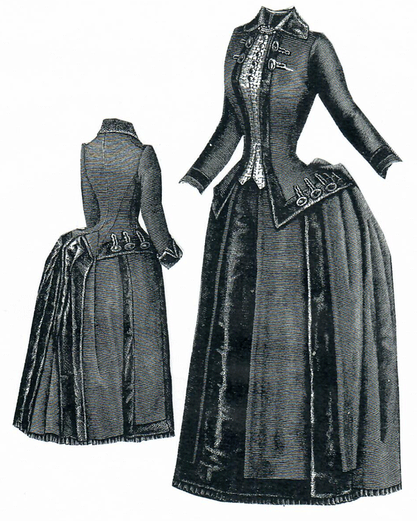 and pocket flaps of velvet. Pattern consists of bodice, draperies,
