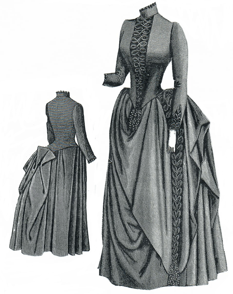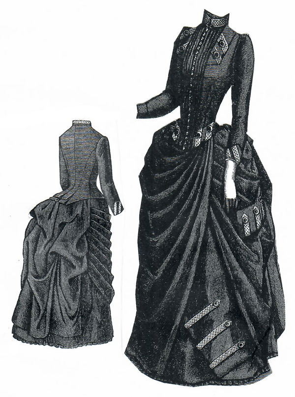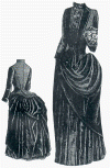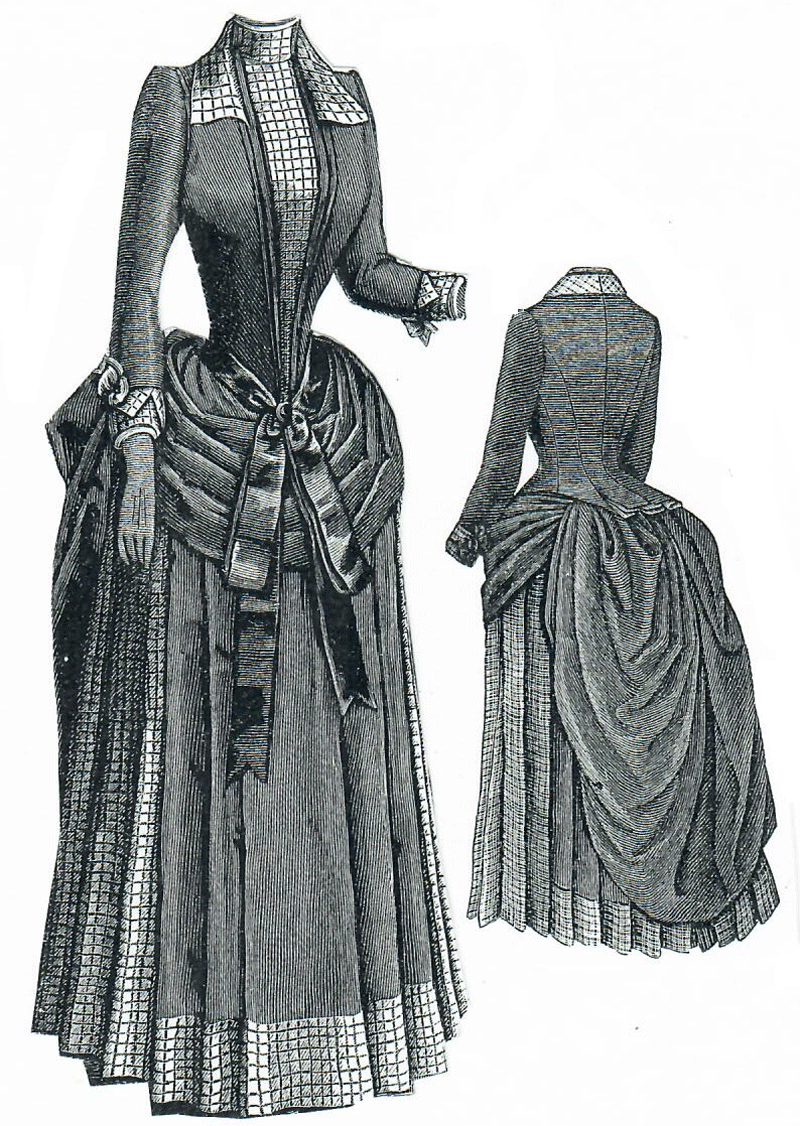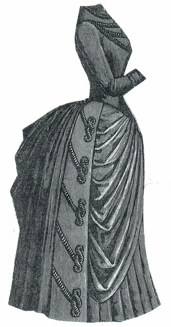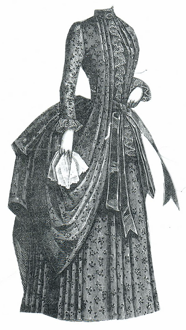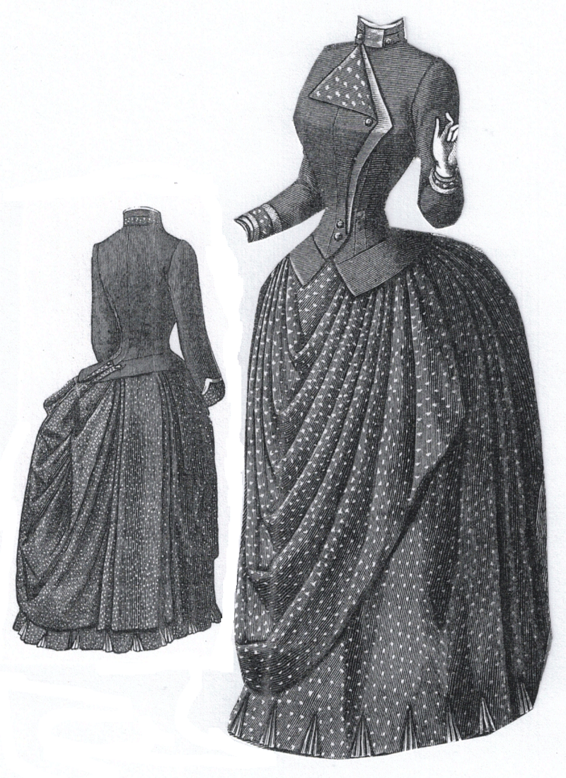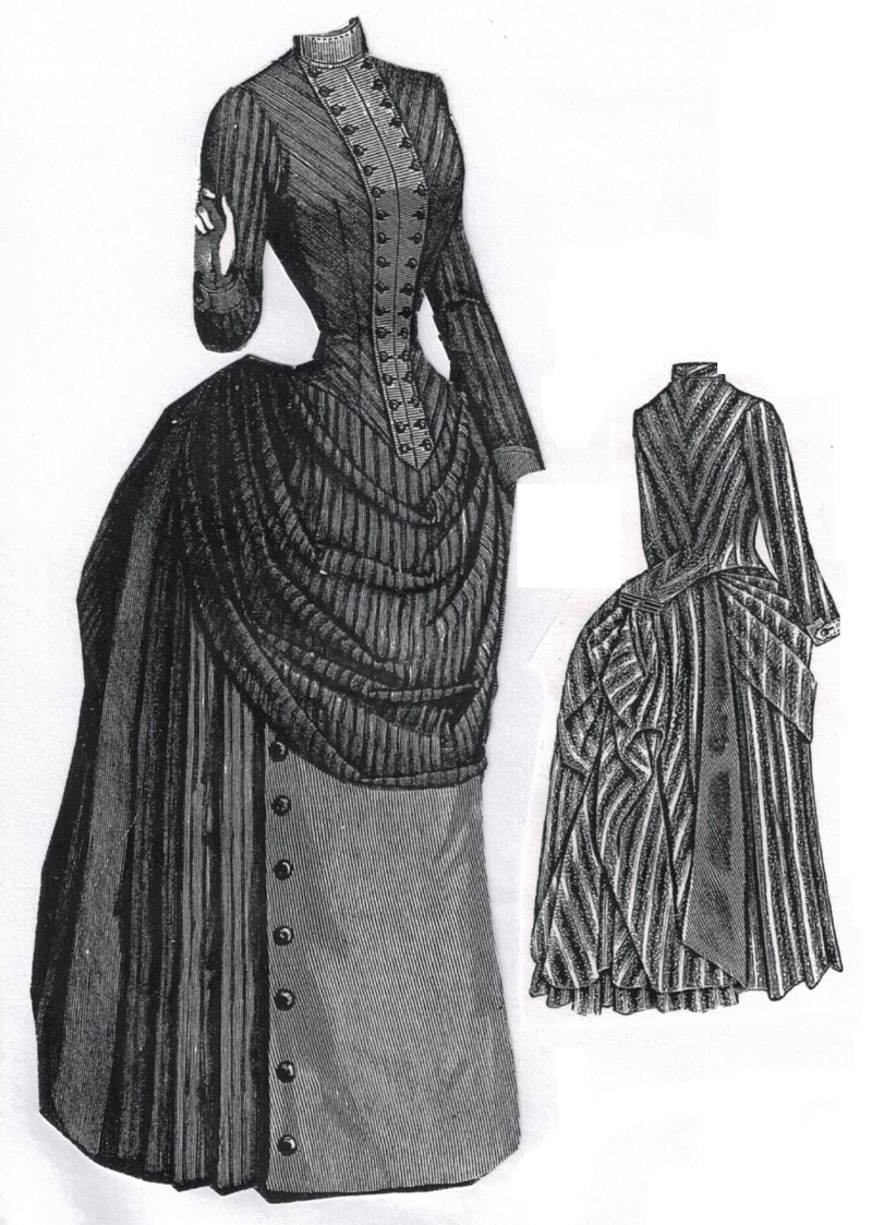 draped overskirt and a basque. Pattern consists of basque, foundation