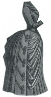plain underskirt of striped gray wool, and a long straight upper skirt of
