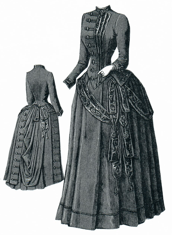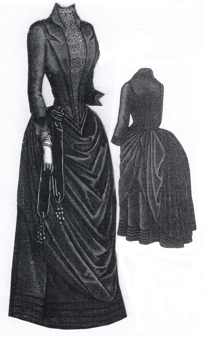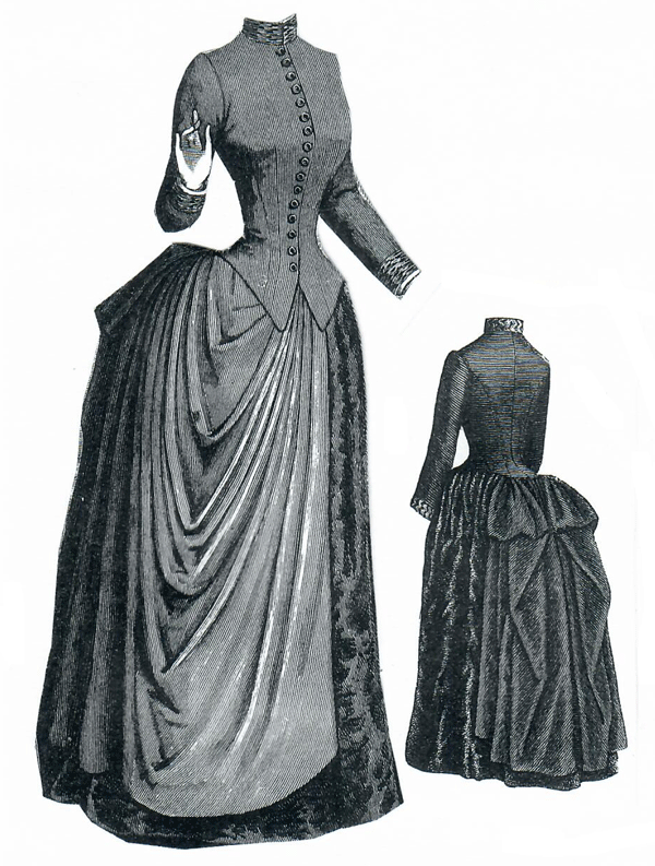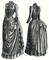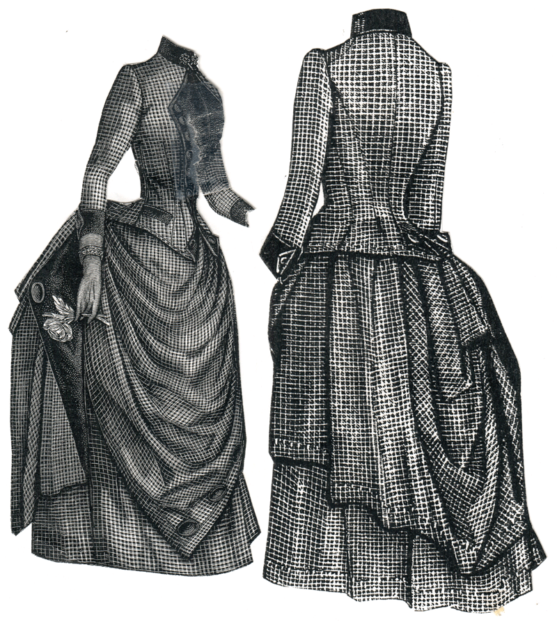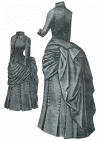 draped overskirt and a basque. Pattern consists of basque, foundation