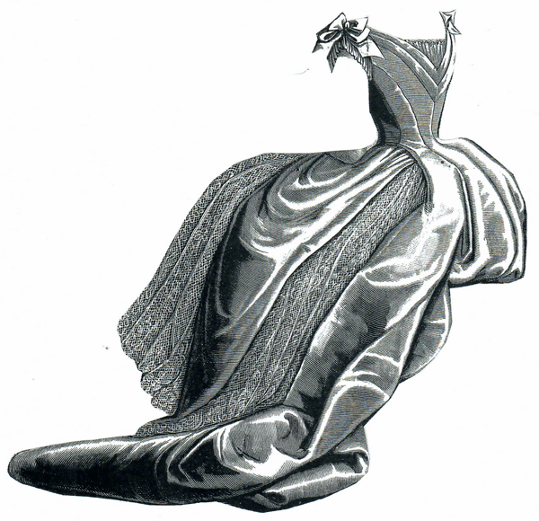 and pocket flaps of velvet. Pattern consists of bodice, draperies,